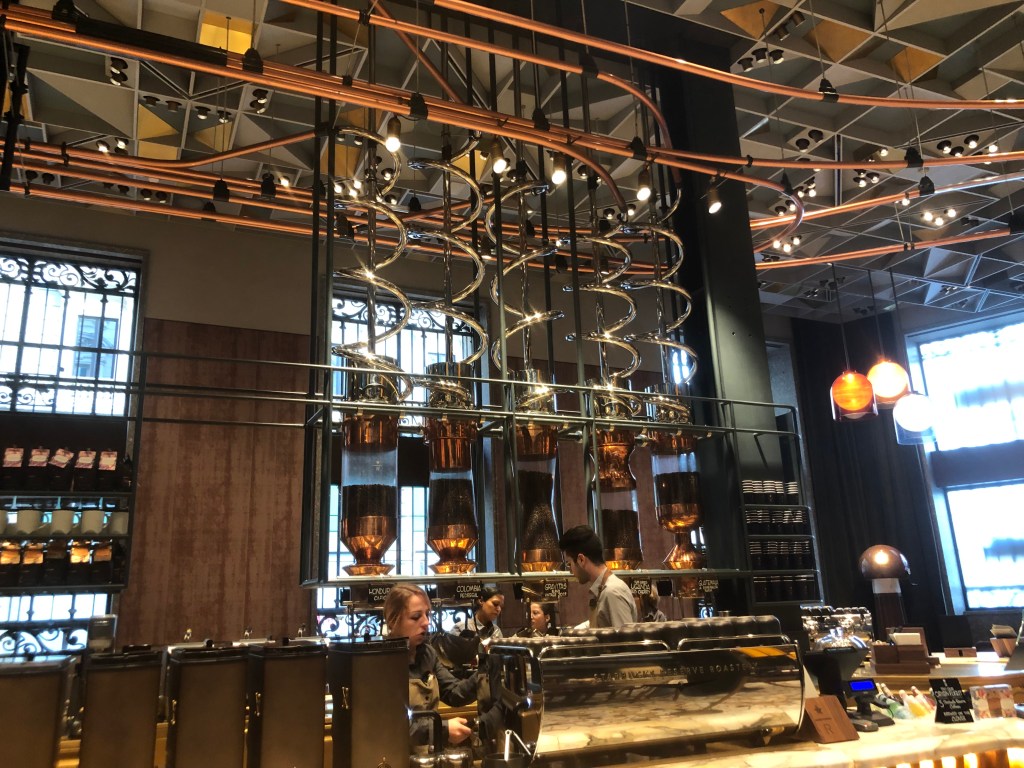 Parce que c’est le lieu incontournable pour mon mari dans chaque grande ville visitée, il a fallu faire starbucks, le bâtiment extérieur était cool mais on s’attendait pas à cet intérieur! C’est gigantesque et vous avez un aperçu du processus de torrefaction.